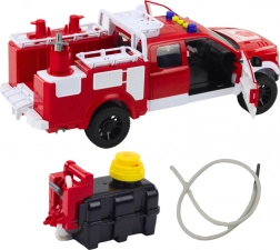 Le camion de pompiers est fabriqué en plastique de haute qualité et comprend de nombreux éléments fonctionnels. Sur le toit du véhicule se trouve un réservoir amovible avec une petite pompe et un tuyau flexible, permettant de jouer à éteindre des incendies en pulvérisant de l’eau. L’enfant peut ainsi imaginer être un véritable pompier et aider à « éteindre » des feux imaginaires à la maison, dans le jardin ou sur le terrain de jeu.