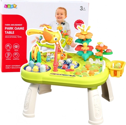 Le set comprend diverses fonctions telles que la pêche aux petits poissons avec une canne spéciale, le jeu tape-taupe (whack-a-mole), le jardinage ou l’association des formes et des couleurs. Chaque activité soutient différents domaines de développement comme la coordination œil-main, la pensée logique, la concentration et l’apprentissage des relations spatiales de base. Des éléments colorés et dynamiques stimulent les sens.