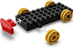 La petite voiture de course avec grandes roues et espace pour la fusée à l’arrière ajoute de la vitesse, des cascades et beaucoup d’imagination au jeu.