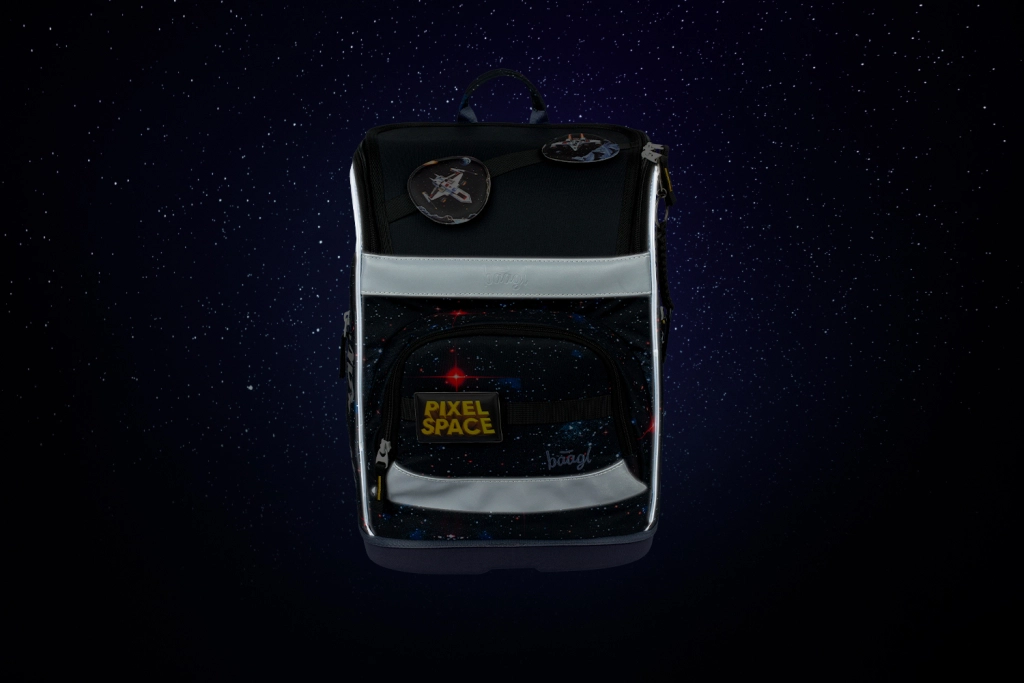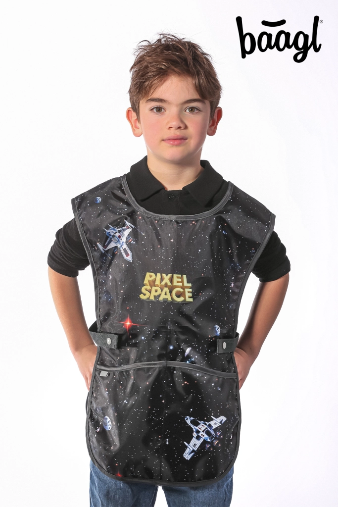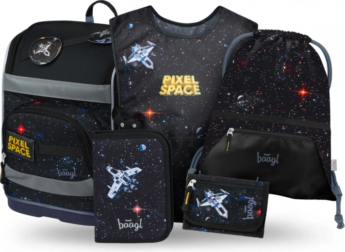 Ce set scolaire Zippy Plus Pixel Space de Baagl comprend une cartable, une trousse, un sac, un tablier et un portemonnaie. Idéal pour les jeunes écoliers avec un accent sur la fonctionnalité et la qualité.