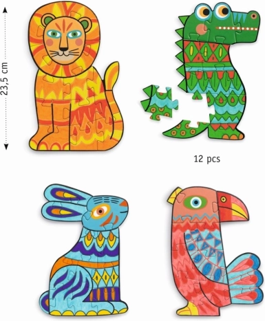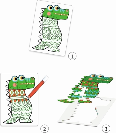 Coffret créatif pour petits artistes et amateurs de puzzles : d’abord on colorie les pièces, puis on assemble selon les contours. 4 images d’animaux de 12 pièces chacune, un jeu qui développe la créativité, la motricité fine et la logique. Emballage écoresponsable respectueux de la nature. Notice incluse, fournitures de dessin non comprises.