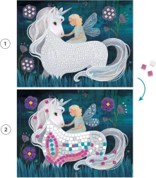 Coffret créatif pour enfants avec 4 planches illustrées, où l’on crée des motifs étincelants à l’aide de carrés autocollants en mousse pailletée et de strass. Idéal pour développer la motricité fine, la concentration et la patience. Un guidage simple numéroté facilite le travail et garantit un succès immédiat même pour les débutants. Le résultat: de mosaïques scintillantes pleines de couleurs et d’imagination.