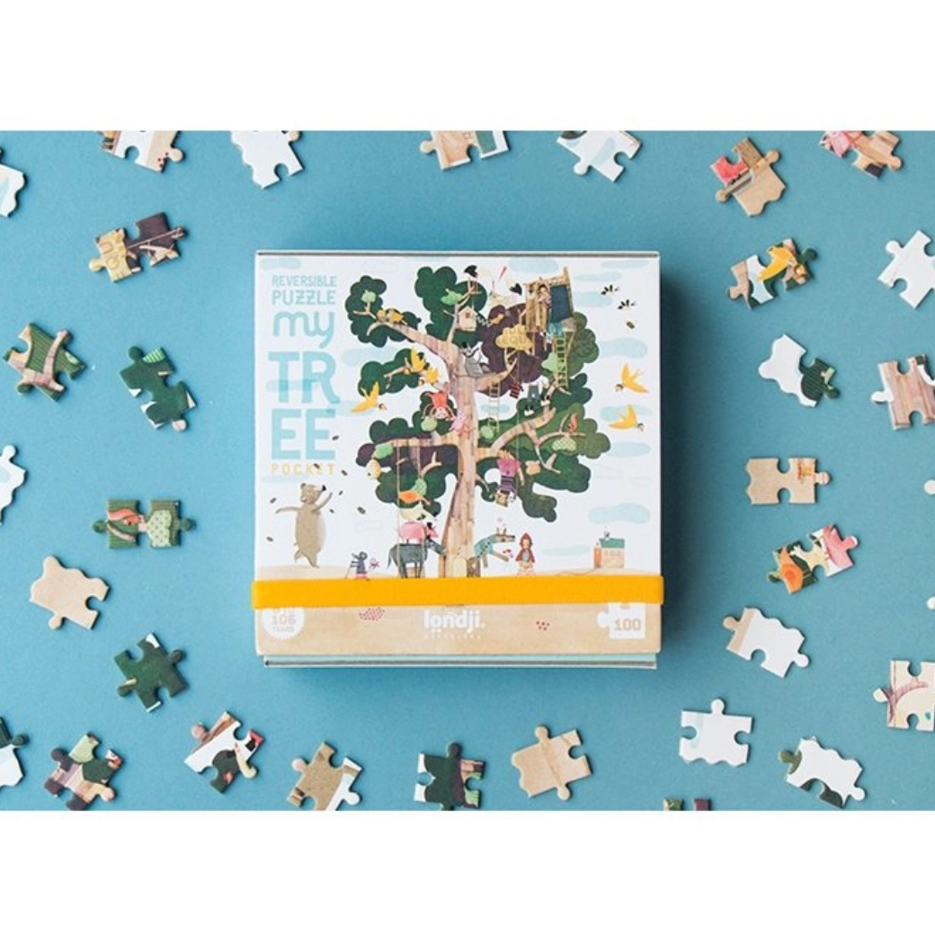 Découvrez l’univers de Londji avec ce puzzle de poche unique, recto-verso. Avec une illustration d’arbre d’un côté et un design surprenant de l’autre, vous profitez d’un divertissement doublé.