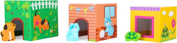 Six adorables petits animaux en bois s’insèrent dans les ouvertures correspondantes des cubes. Les enfants s’exercent au tri, à l’association et au jeu imaginatif.
