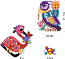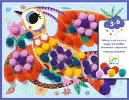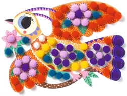 Set de collages créatifs DJECO pour enfants, permettant de réaliser des designs originaux avec des pompons colorés, développant la créativité et la motricité fine.