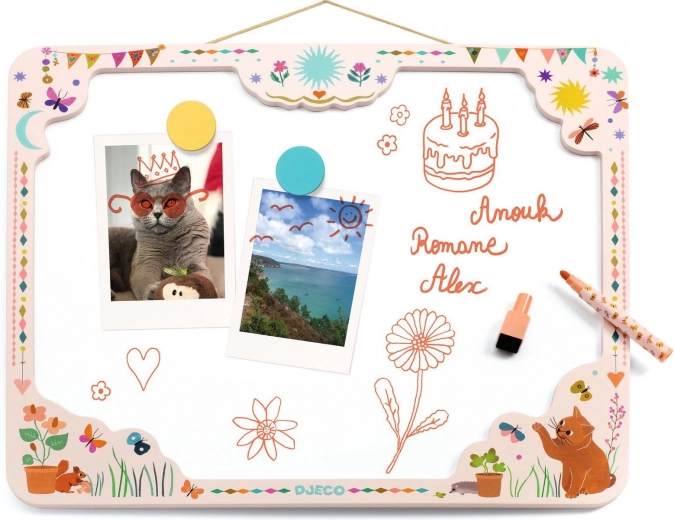 Tableau magnétique stylé au motif de chat de la marque DJECO pour chambres d’enfants et salles de jeux. Il possède un cadre en bois, une surface métallique pour écrire/aimantée, une ficelle colorée pour la suspension et un feutre effaçable à sec avec capuchon magnétique. Idéal pour dessiner, écrire des messages et fixer des aimants.