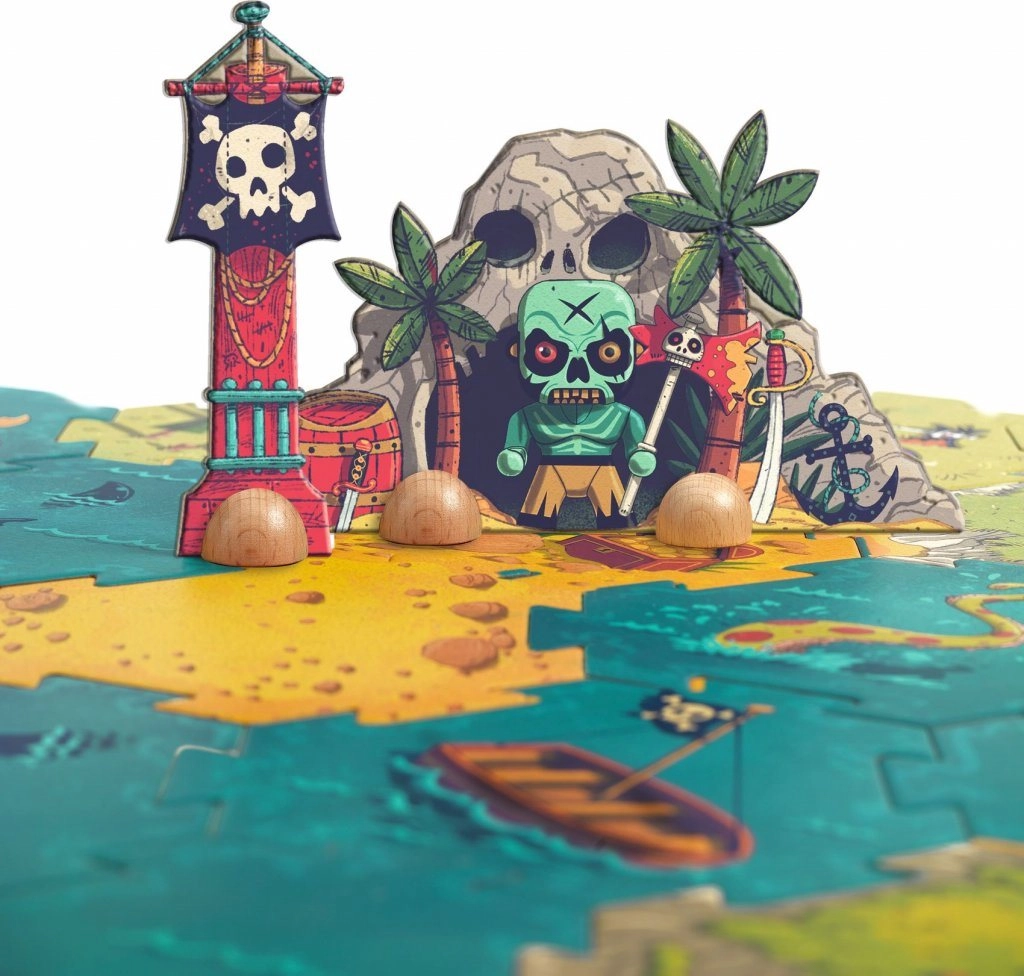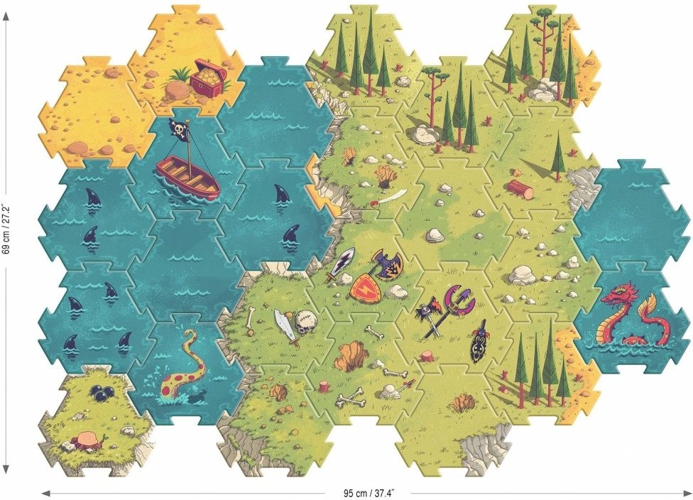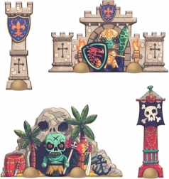 Ce set original combine la joie du puzzle avec le jeu créatif. 26 grandes pièces hexagonales permettent d’assembler une vaste scène, tandis que 4 décors verticaux sur socles en bois donnent un effet de profondeur à toute la bataille. Les pièces sont fabriquées en carton très robuste certifié FSC®, pour résister aux manipulations répétées.