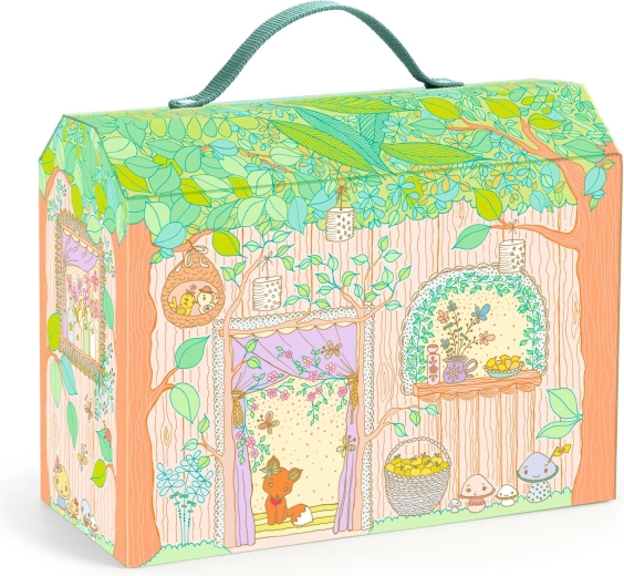La valise pliable illustrée de forêt se transforme, une fois ouverte, en une scène à plusieurs niveaux avec étagères, petite table et cour dépliable.