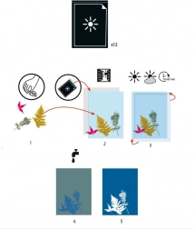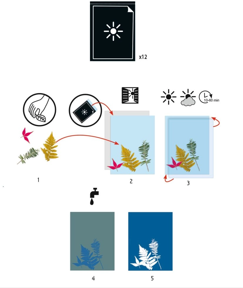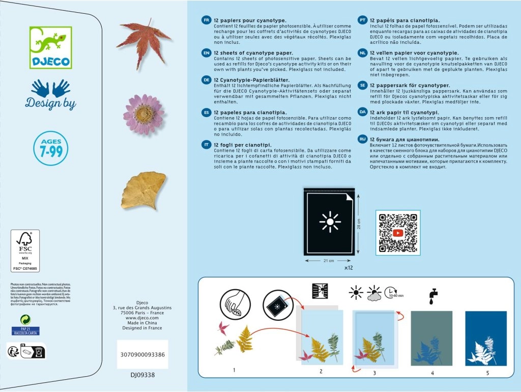 Avec le set de papiers photosensibles Djeco, transformez les rayons du soleil en expérience créative. Placez sur la feuille des éléments naturels, des pochoirs ou de petits objets, laissez agir le soleil, puis rincez à l’eau : sur le fond bleu apparaissent de délicates ombres et silhouettes. Un procédé simple pour des résultats saisissants.