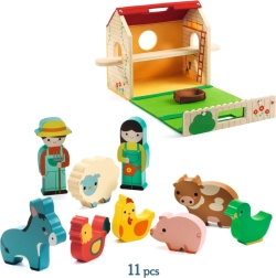 - 9 figurines en bois – poule, coq, canard, âne, mouton, cochon, vache, fermier et fermière.