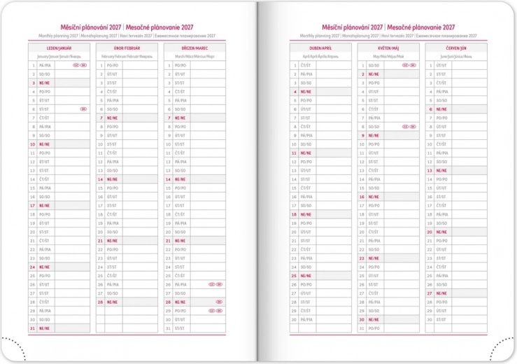 L’agenda est complété par un calendrier tchéco-slovaque avec compléments en anglais, allemand, hongrois et russe.