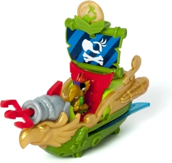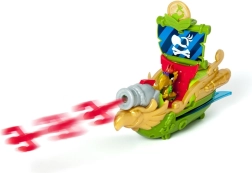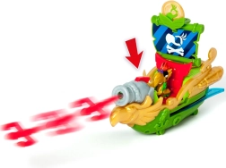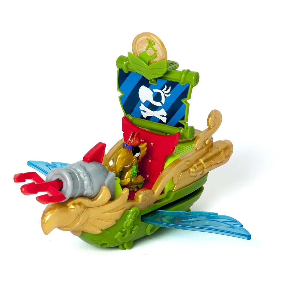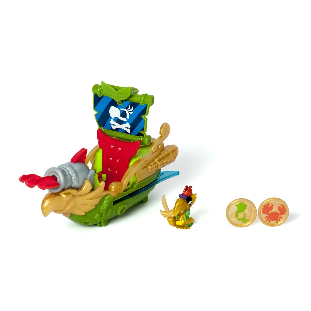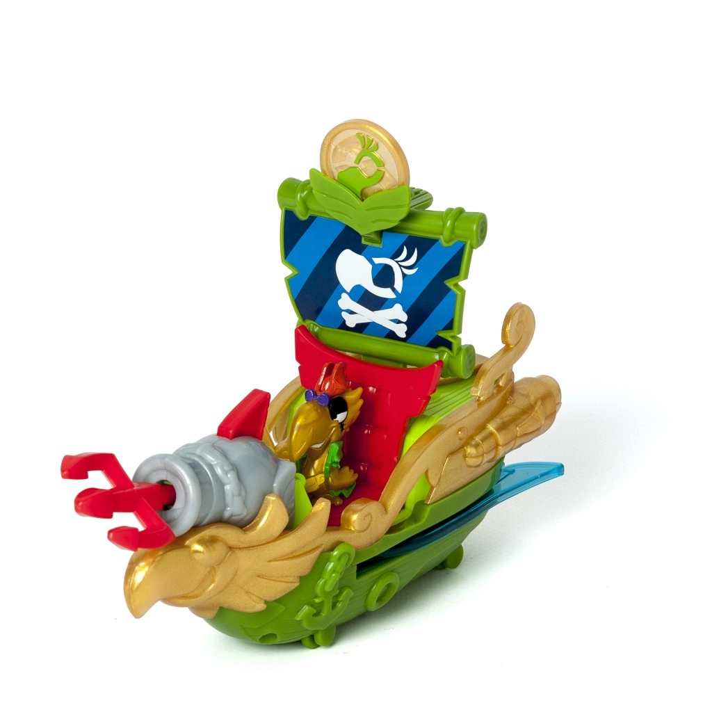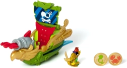 La combinaison de vert, d’or et de rouge offre un jeu haut en couleur au thème pirate. Un canon à projectiles est également inclus.
