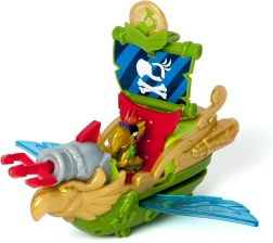 Ce navire comporte des détails comme un crâne avec des os croisés et un oiseau à la proue. Il est conçu pour le jeu imaginatif avec des mécanismes rotatifs.