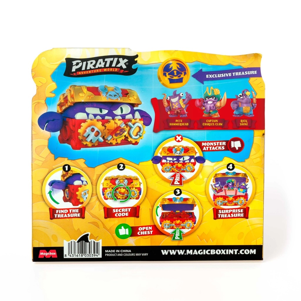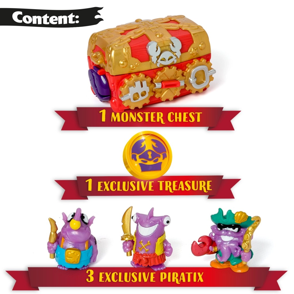 - 1 Coffre du Trésor du Monstre, 3 figurines Piratix exclusives, 1 pièce de trésor exclusive, 3 accessoires