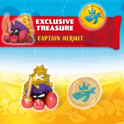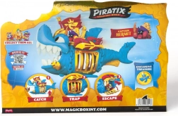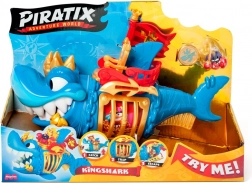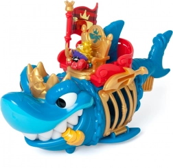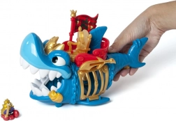 Appréciez les détails soignés du requin bleu et or avec son trône, ainsi que le capitaine pirate, prêt pour chaque aventure.