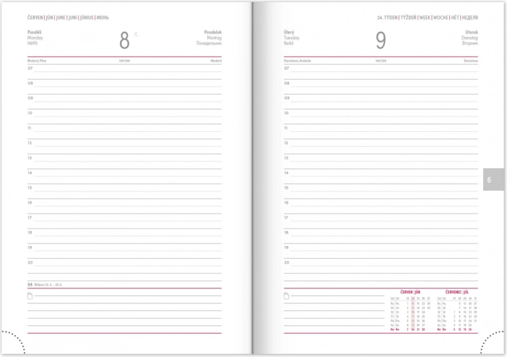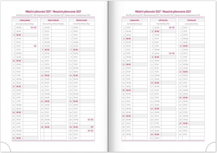 - Inclut un calendrier de planification professionnelle et une liste des jours fériés en République tchèque et slovaque ainsi que des fêtes internationales.