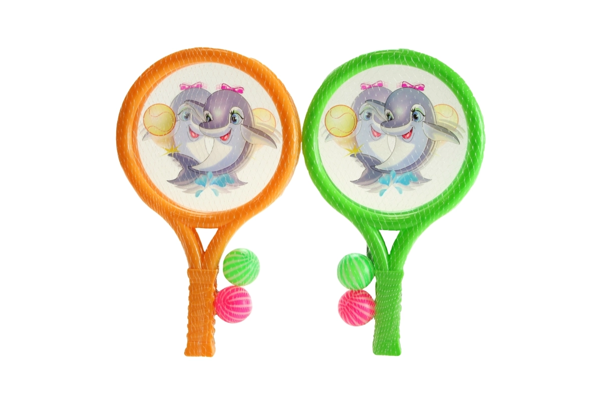 Des raquettes en plastique pour enfants avec motif de dauphin et balles incluses, idéales pour des jeux amusants et actifs au jardin ou à la plage. L’emballage comprend deux raquettes et deux balles.