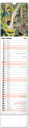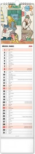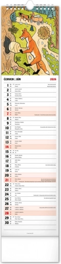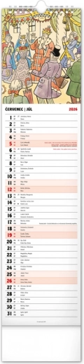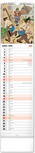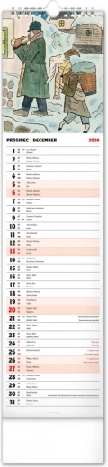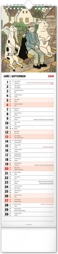Calendrier mural Josef Lada 2026 avec illustrations en tchèque et en slovaque, espace pour les notes.