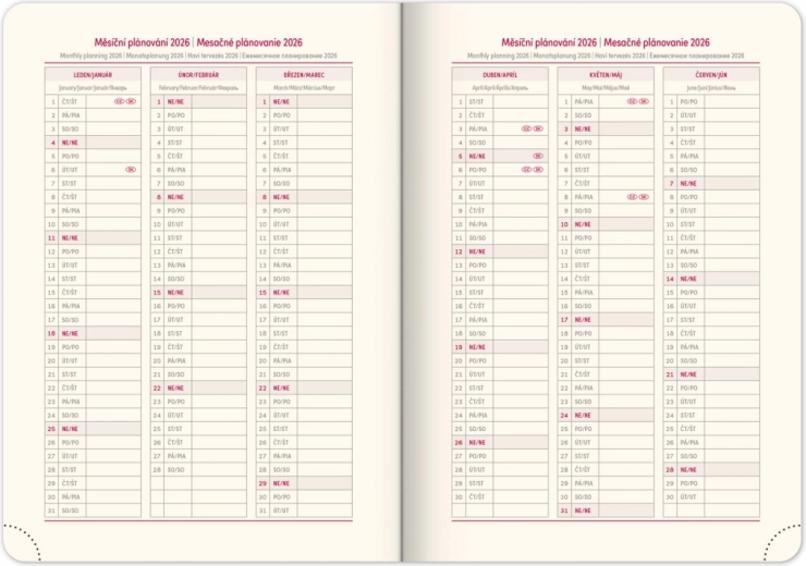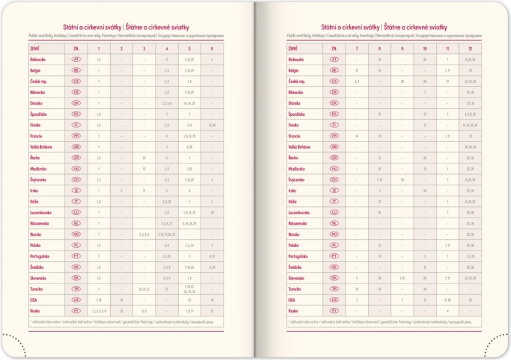Ce journal stylé est équipé de coins arrondis, d'un porte-stylo et d'un élastique, ce qui le rend pratique lors de vos déplacements. Il contient un calendrier tchéco-slovaque, complété par l'anglais, l'allemand, le hongrois et le russe.