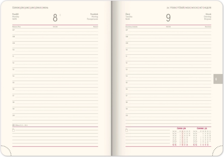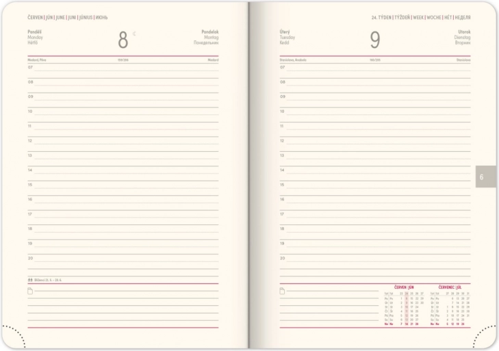 L'agenda Diamante 2026 offre un emploi du temps quotidien avec un calendrier tchèque-slovaque et des langues supplémentaires - anglais, allemand, hongrois et russe. C'est un choix parfait pour organiser votre temps avec les éléments suivants :