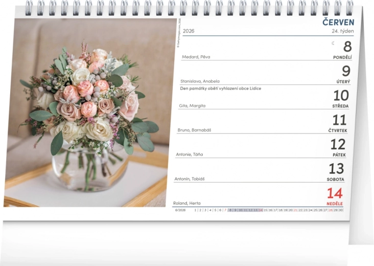Des fleurs sur chaque table avec notre magnifique calendrier de table Kytice 2026. Il inclut les noms tchèques et slovaques, les fêtes et les phases lunaires.