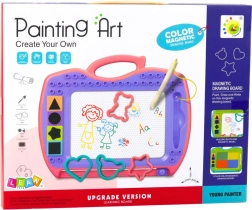 L'ensemble comprend quatre tampons différents et quatre pochoirs pour tracer, qui soutiennent le développement de la créativité et permettent de faire facilement les premiers pas dans le dessin. Le champ magnétique coloré attire l'attention de l'enfant et les dimensions compactes avec une poignée pratique permettent de transporter facilement le tableau partout - en promenade, en voiture ou en voyage.