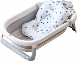 La baignoire est équipée d'un cadre pliant stable avec des pieds antidérapants qui augmentent l'adhérence et empêchent tout glissement involontaire. Elle est fabriquée à partir de matériaux sûrs et non toxiques en PP et TPE, doux pour la peau délicate des bébés et résistant aux dommages. Le kit comprend un coussin de bain moelleux, qui maintient l'enfant dans une position confortable et lui procure chaleur et sécurité.