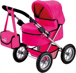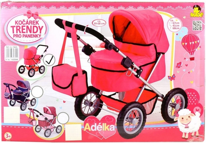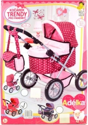 Poussette landau au design moderne de couleur rose, idéale pour des poupées jusqu’à 42 cm, incluant la poupée Adélka. Facile à plier et déplier pour des sorties pratiques.