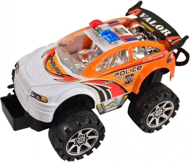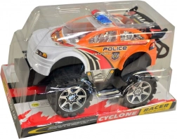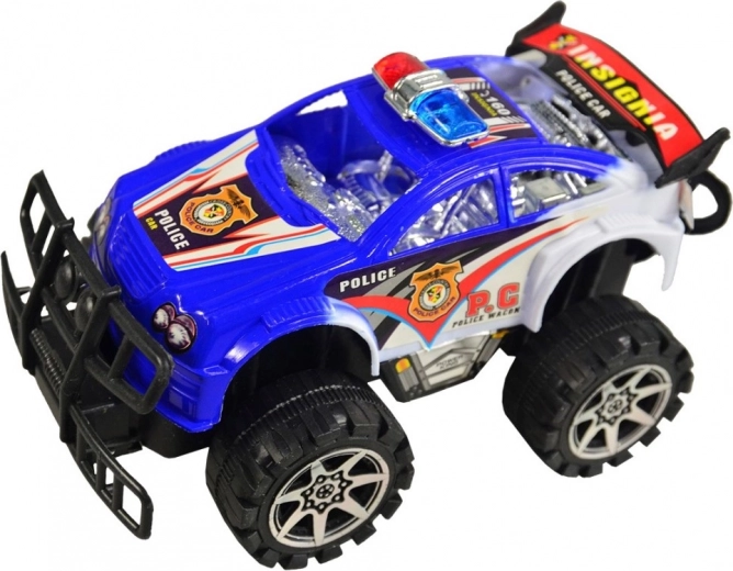 Voiture de police tout-terrain, jouet idéal pour les petits aventuriers. Elle se distingue par son matériau en plastique et ses grandes roues qui gèrent même les terrains irréguliers.