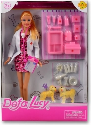 Devenez vétérinaire avec la poupée Lucy et ses adorables chiots. Set complet avec blouse blanche et accessoires pour examiner les patients animaux.