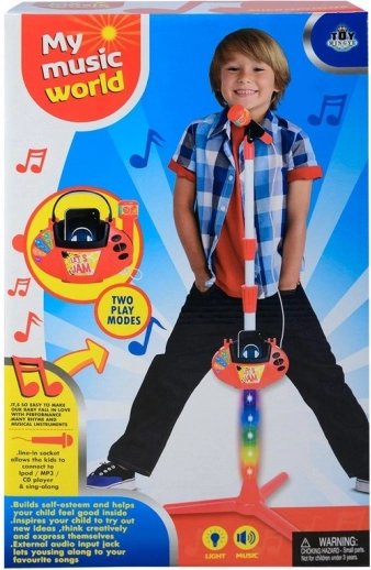 Devenez une star de la scène avec notre microphone pour enfants. Connectez un lecteur MP3 ou un smartphone à l’unité de contrôle du pied et chantez sur vos chansons préférées. Le microphone est alimenté par 3 piles AA 1,5 V et convient aux enfants à partir de 3 ans.