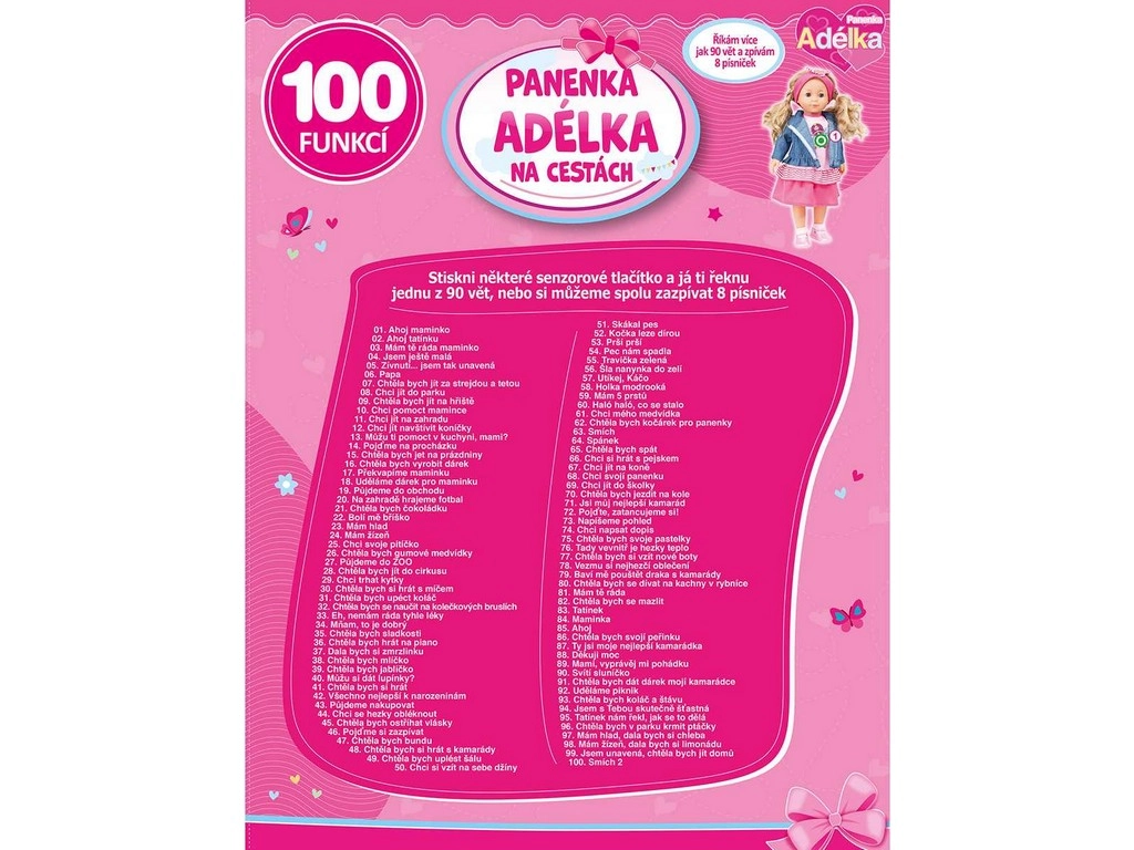 Découvrez la magie du rôle maternel avec la poupée Adélka. Cette poupée unique est équipée de 90 phrases tchèques comme "maman, raconte-moi une histoire" ou "Je t'aime maman!", que ce jouet interactif prononce. De plus, elle chante huit chansons tchèques traditionnelles comme "Fille aux yeux bleus" ou "Le chien a sauté" et elle sait aussi rire. Avec chaque pression sur un endroit sélectionné, les enfants vivent une aventure d'une heure.