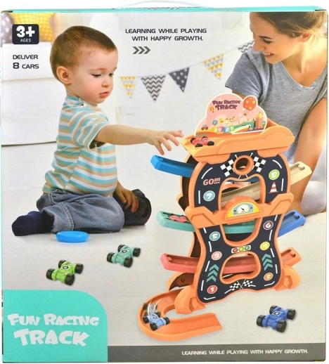 Circuit automobile à étages pour enfants avec voitures, offrant du divertissement et développant la créativité des enfants. Comprend 8 voitures de couleurs différentes.