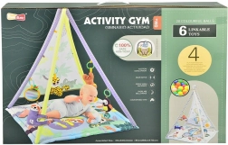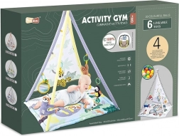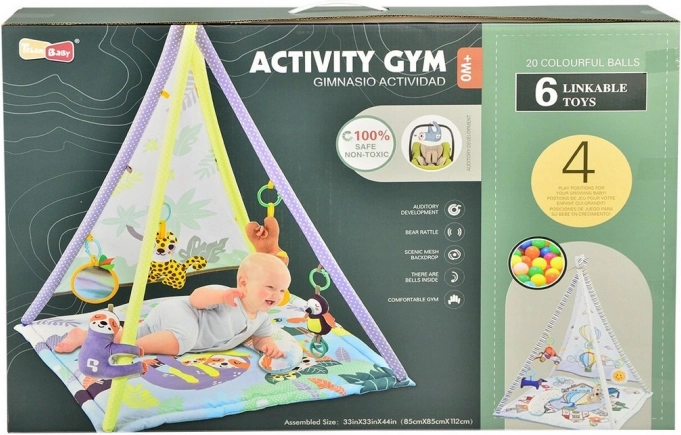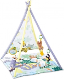 Ce tapis avec tente aux couleurs contrastées séduit par son esthétique et sa fonctionnalité. Conçu pour divertir et éveiller les enfants, il est équipé d’éléments musicaux et d’autres accessoires :