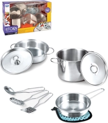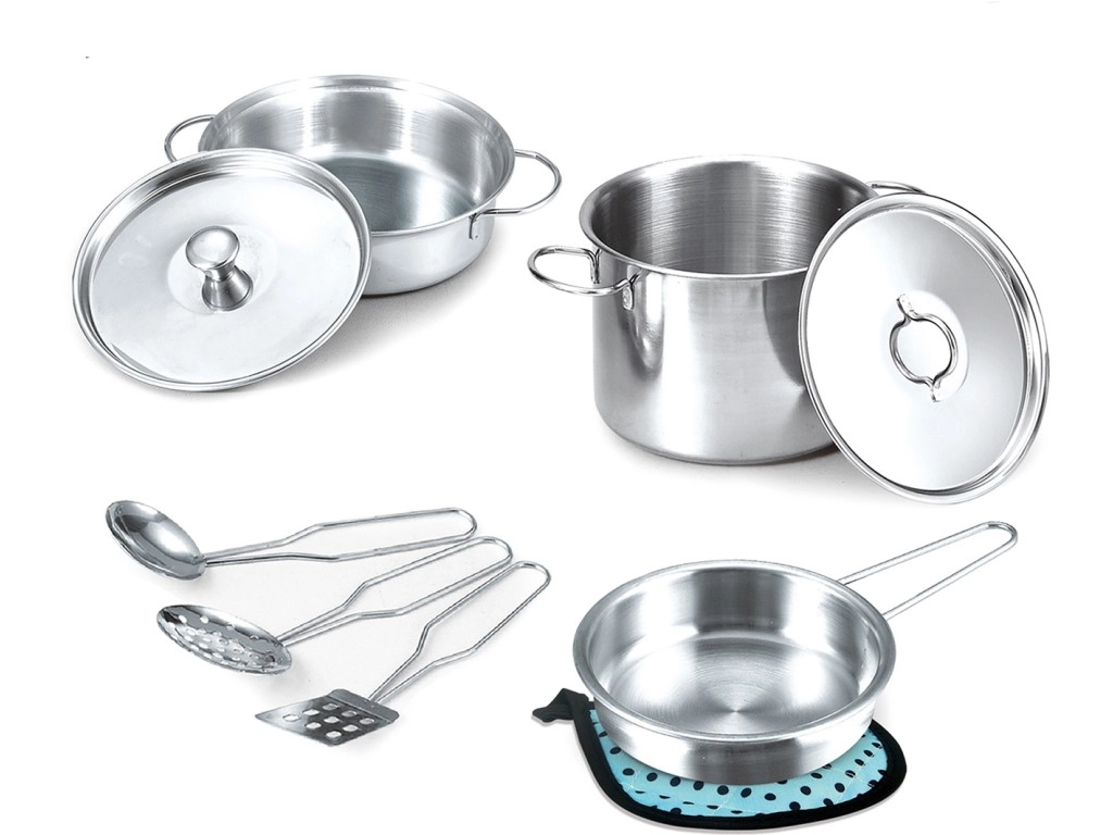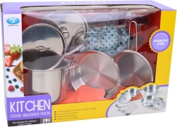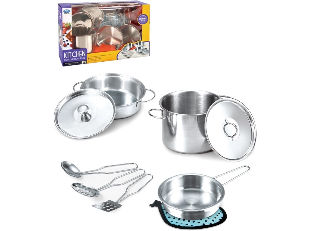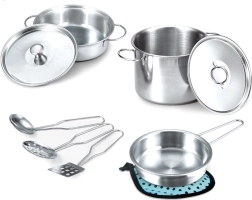 Ce set de batterie de cuisine en acier inoxydable comprend neuf pièces qui enrichiront les jeux de cuisine des enfants. Montrez à vos enfants comment on cuisine avec cet excellent ensemble. La vaisselle est fabriquée en tôle, ce qui la rend sûre et résistante pour les jeux d'enfants. L'emballage cadeau de type window box garantit que l'ensemble fera forte impression dès le premier regard.