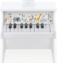 Piano en bois pour enfants dès 3 ans, illustré par Sarah Betz, offre une découverte ludique de la musique. Fabriqué en bois de qualité et sans électronique.