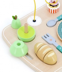 Ce plateau d’activités en bois de la marque Vilac offre aux enfants de formidables moments de jeu tout en développant leur motricité fine et leur coordination. Il comprend une poire empilable, un pain à trancher et une glace avec pièces mobiles. Idéal pour les petites mains.