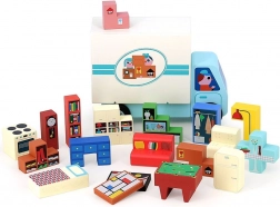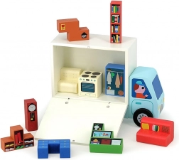 Le set comprend un camion de déménagement en bois et 19 pièces de meubles, idéal pour jouer seul ou en famille.