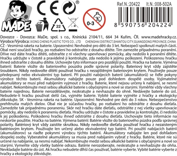 Pour un fonctionnement optimal, deux piles AA sont requises (non incluses), ce qui permet un jeu interactif. La fusée spatiale est emballée dans une boîte compacte et constitue un excellent choix principalement pour les garçons.