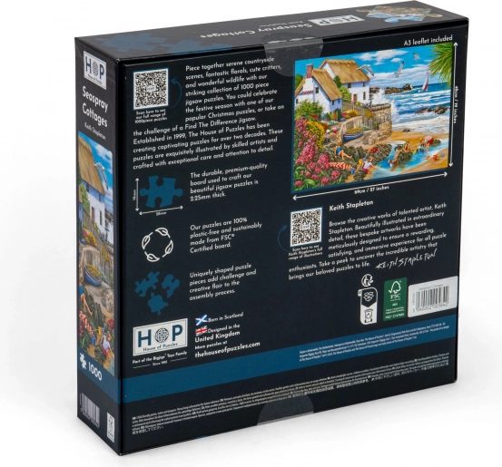 Puzzle unique Chalet sur le littoral avec 1000 pièces, formes irrégulières pour un plaisir accru, l’emballage comprend un poster.