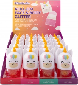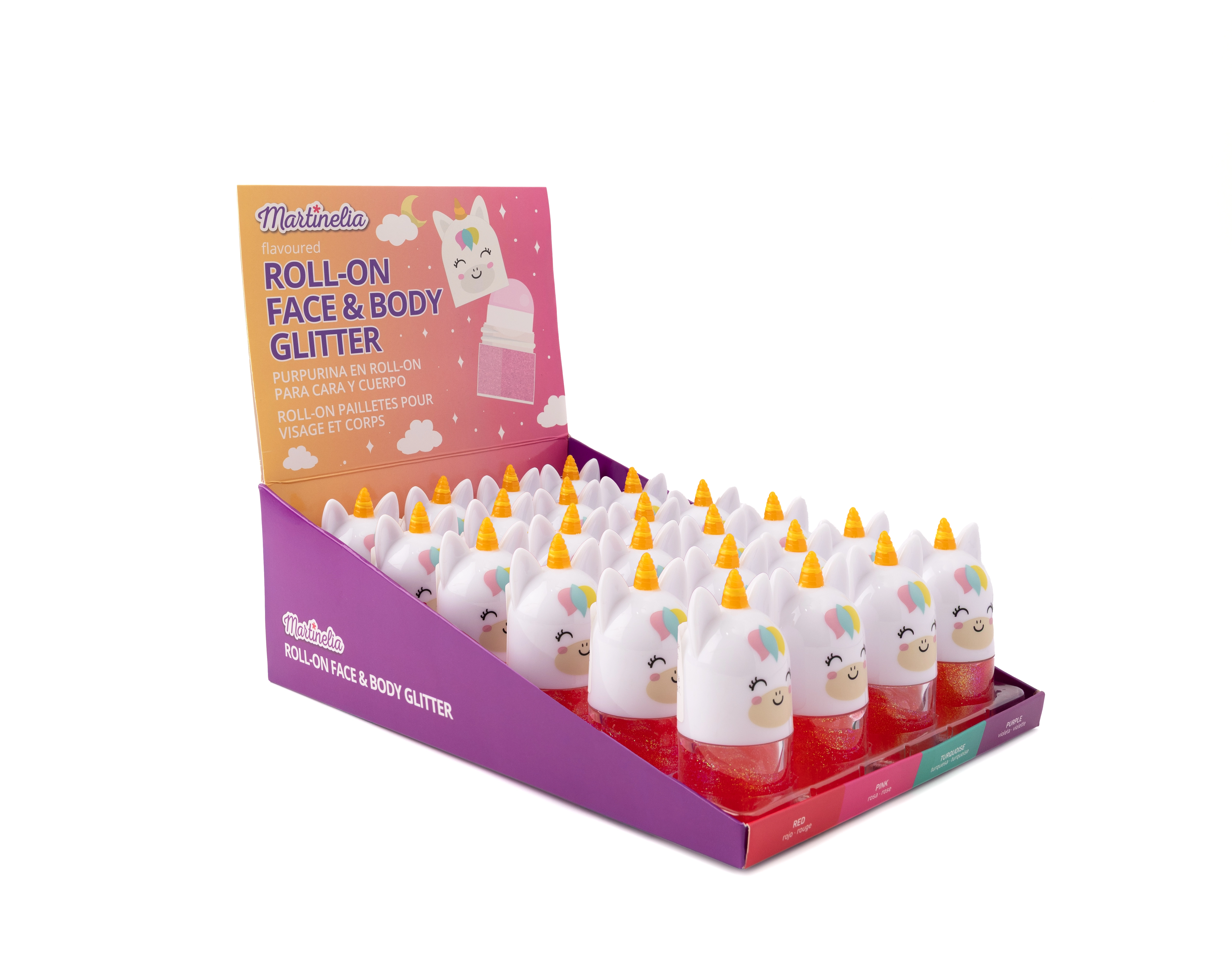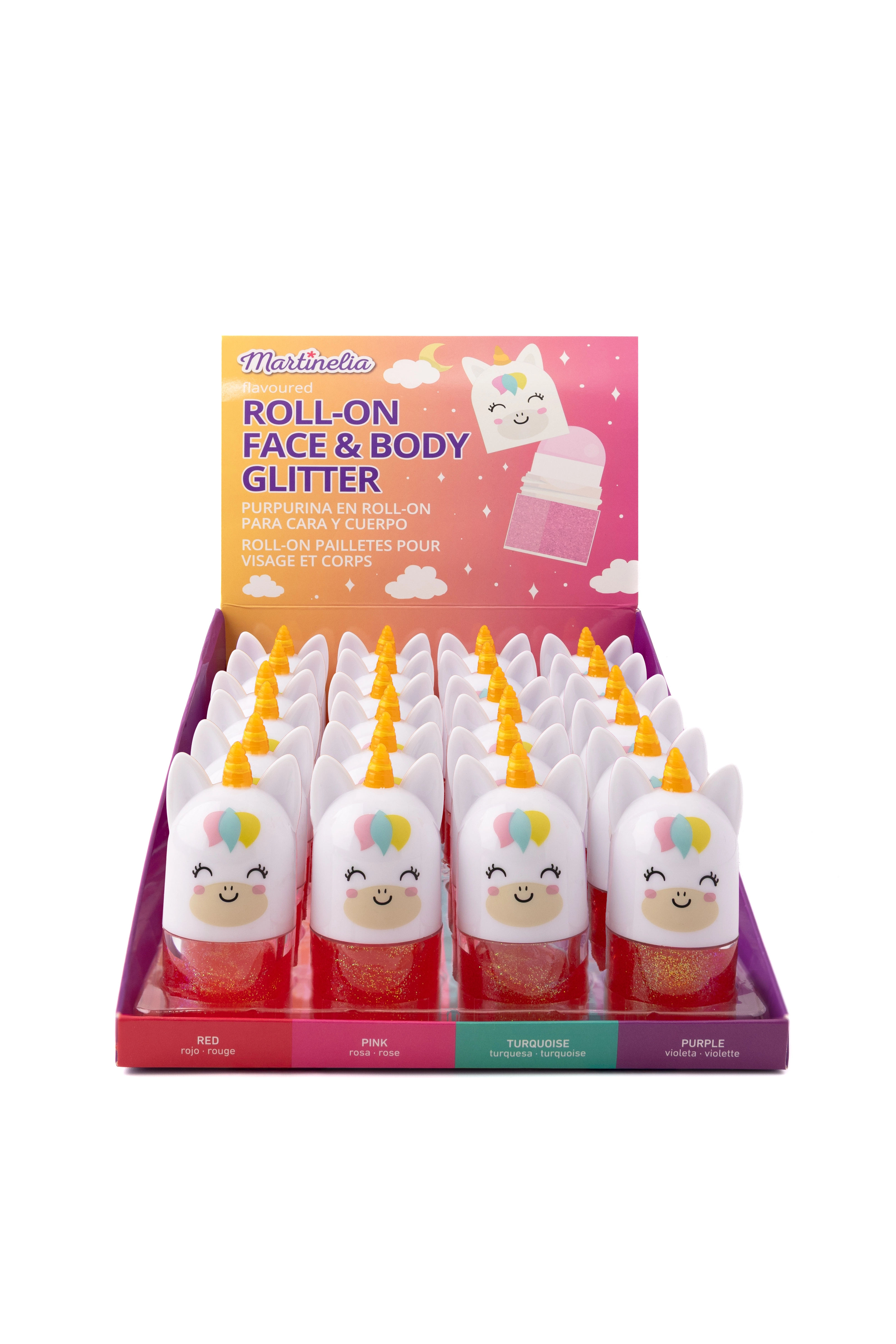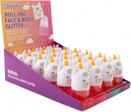 Roll-on scintillant Martinelia pour le corps et le visage. Application facile, formule douce et effet scintillant longue durée.