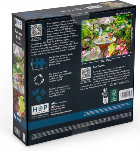 Puzzle Oiseaux d’été de la société House of Puzzles offre un divertissement avec 1000 pièces aux formes uniques et irrégulières, augmentant le défi et le plaisir de l’assemblage.
