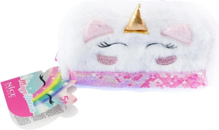 Trousse en peluche motif licorne offre un espace idéal pour ranger crayons, stylos et fournitures scolaires grâce à son design avec ruban pailleté réversible et sa fermeture éclair pratique.