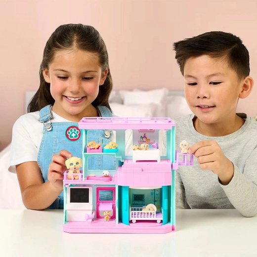 Que contient ce set ? Dans cette clinique, vous trouverez tout ce dont vous avez besoin pour prendre soin des chiots : des gamelles, des coussins, une radiographie, une baignoire, des petits lits et même un ascenseur pour transporter les petits animaux ! Chaque recoin de la clinique regorge de surprises pour rendre vos soins aux toutous uniques.