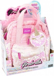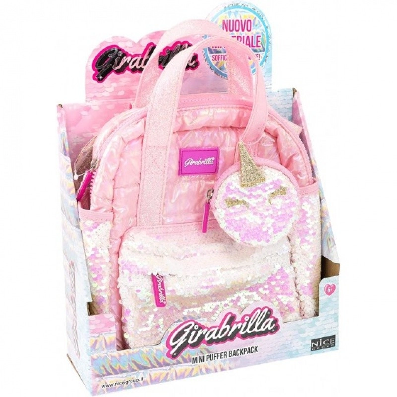 Mini sac à dos rose stylé fabriqué en tissu doux et iridescent, comprenant des poches à paillettes colorées et un portefeuille unique en forme de licorne.