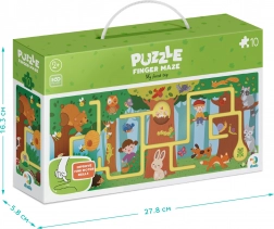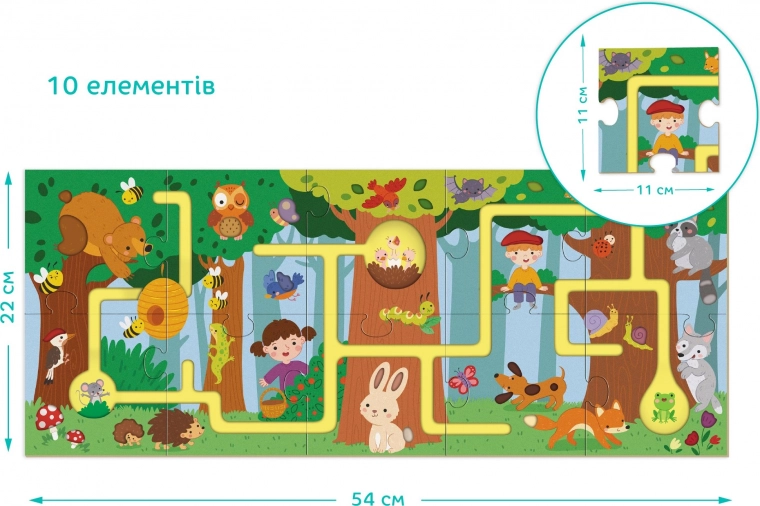 Ce superbe puzzle offre une façon ludique d’explorer la forêt : les enfants peuvent suivre du doigt les rainures et parcourir un adorable trajet rempli d’écureuils, de lapins, de hérissons et d’oiseaux. Les illustrations apportent une touche de magie à l’activité et permettent aux enfants d’apprendre à reconnaître les animaux de la forêt. Le puzzle est conçu pour développer la motricité fine, la coordination, l’attention et l’imagination des tout-petits.