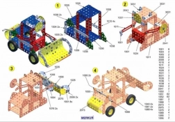 L'ensemble inclut un livret d'instructions qui vous guide pas à pas pour construire 30 modèles, tels qu'une scie à ruban, une grue, un camion ou un wagon. Les premières pages offrent des conseils de base sur l'assemblage des pièces, l'utilisation de contre-écrous et d'autres techniques nécessaires pour le modélisme.
