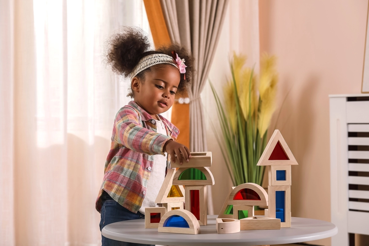 - construction, tri des formes et des couleurs, jeu sensoriel avec la lumière