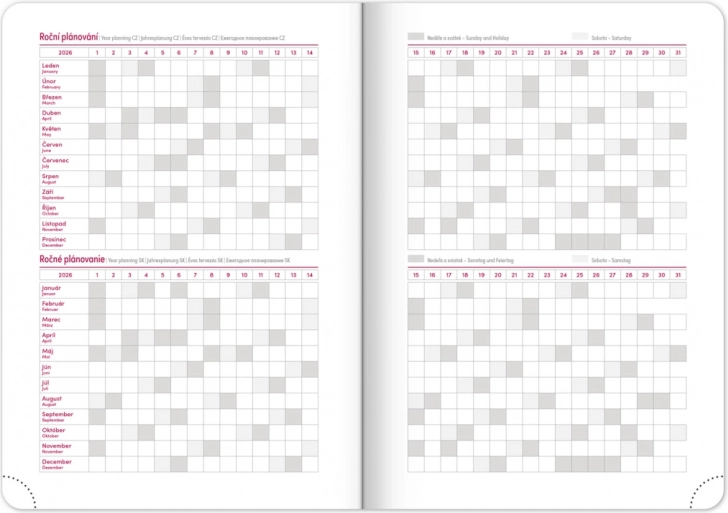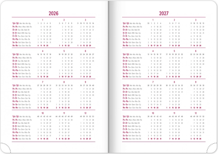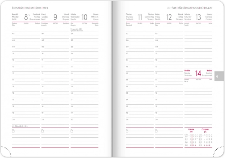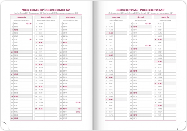 - Comprend une vue hebdomadaire avec calendrier tchéco-slovaque et langues additionnelles : anglais, allemand, hongrois et russe.