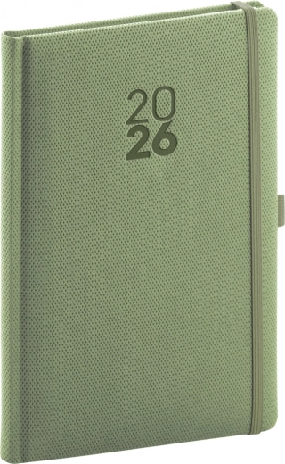 Élégant agenda hebdomadaire Diamante 2026 de couleur olive avec une fine texture rappelant la taille du diamant, idéal pour la planification personnelle et professionnelle.